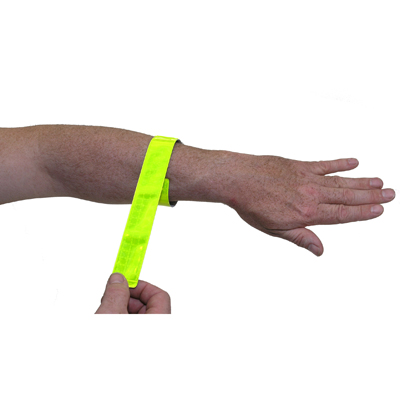 Ce bracelet de sécurité jaune réfléchissant s’entoure autour du bras ou de la cheville en un seul geste.